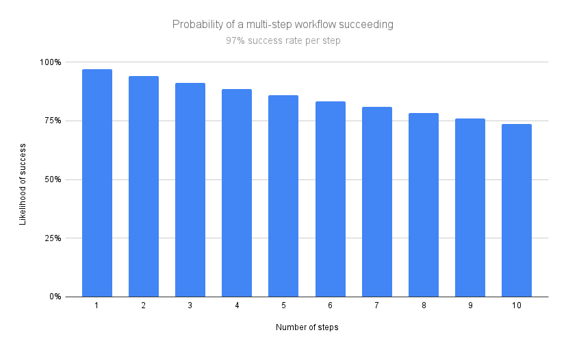 Consider an agent with an average 97% per-step success rate. When it performs a task with just 10-steps, suddenly our success rate drops from 97% to 75%.
